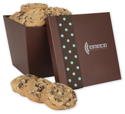 A delicious treat, gorgeously packaged to attract a lot of attention: the Large Tapered Cookie Box. High-end retail look: Large tapered hat box decorated with your company logo and teal polka-dot ribbon. Please a crowd: Includes 15 large chocolate-chip cookies. Premium in every way:High-quality kosher ingredients.