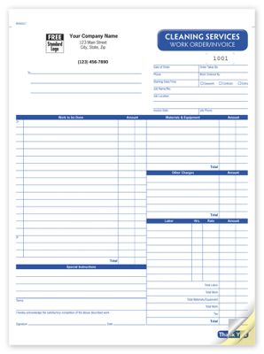 Just for cleaning professionals. Work order and invoice in one multi-part form. Plenty of room for all the details. Take complete orders: Preprinted areas simplify write-ups of work to be done, labor, materials and more. Track customer acceptance: Signature line for customer authorization prevents disputes. Create clean records: Carbonless forms stay tightly aligned for clear, clean copies.