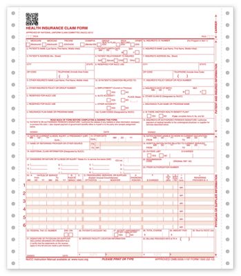 Speed third-party billing and manage your cash flow with this AMA and CMS approved claim form for your continuous printer. Includes all updates to the 02/12 version approved by the NUCC (National Uniform Claim Committee) Convenient and easy to use! 1-part form on 20# white bond stock, printed in OCR red ink. Accommodates NPI numbers as mandated by HIPAA. Accepted by most health insurance companies.