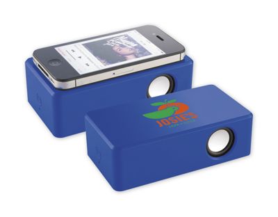 Amplified sound, simplified: The battery-operated Vigo Vibration Speaker with your logo on the side. Fine-tuned for easy use: Simply place mobile phone on speaker's flat surface and sound is amplified. So smart: No wireless settings or cables needed; batteries included. Sturdy construction: ABS plastic; comes individually gift boxed.
