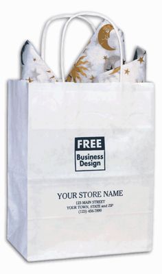 White Paper Shoppers Cub, : Promote your shop in style! Attractive custom imprinted shopping bags are essential when it comes to protecting customer purchases. Plus, add your store name and you'll have a walking billboard. 8 1/4 W x 4 1/4 D x 10 3/4 H 250 bags per case. 60# white kraft paper.